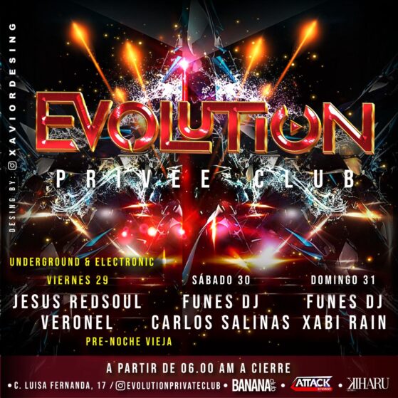 DESCRIPCIÓN Fecha2023-12-31HoraDesde las 06:00 a 12:00.LugarEvolution Privee CLUB - MadridDirecciónCalle Luisa Fernanda 17, 28008 Madrid CARTEL